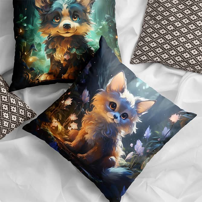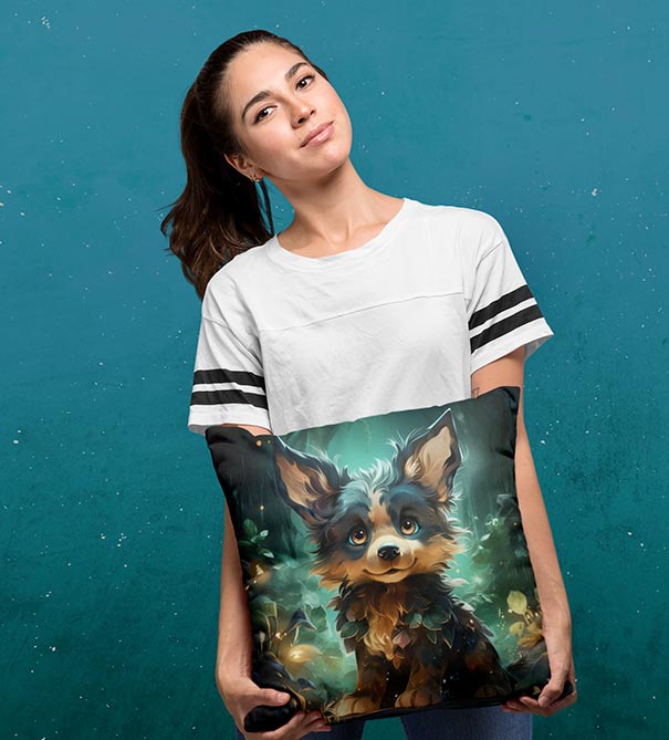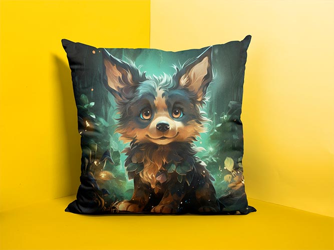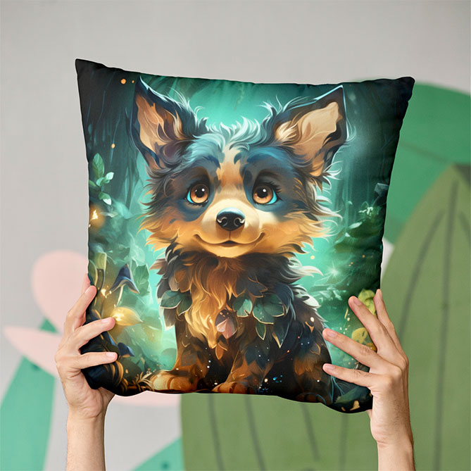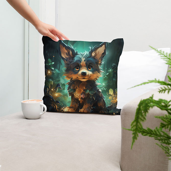 Декоративна подушка «Казковий ліс. Милий песик» пошита з м’якого, приємного на дотик флока. Наповнювач подушки – холлофайбер високої якості.