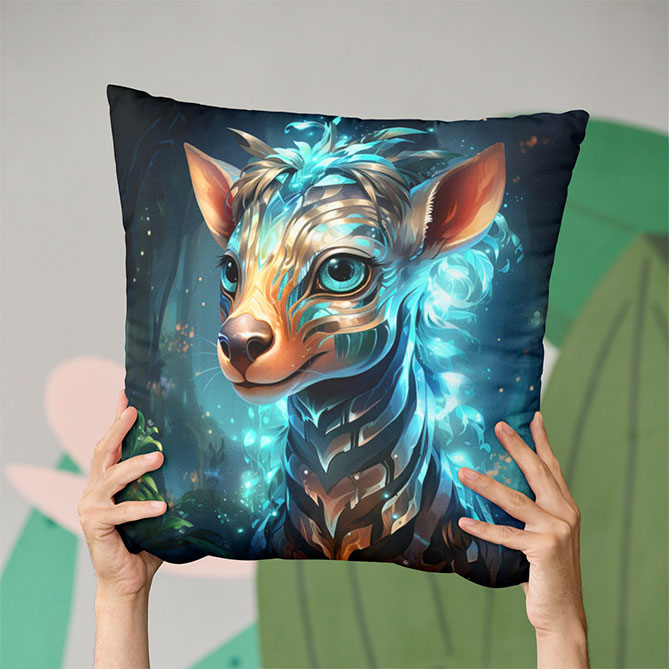 Декоративна подушка «Казковий ліс. Сяюче зебренятко» пошита з м’якого, приємного на дотик флока. Наповнювач подушки – холлофайбер високої якості.