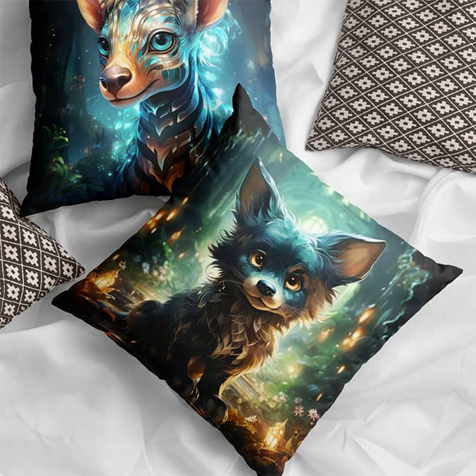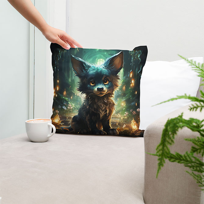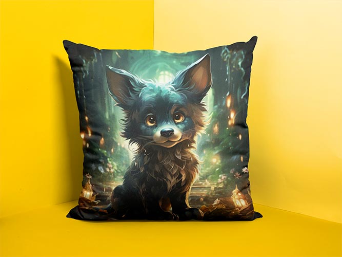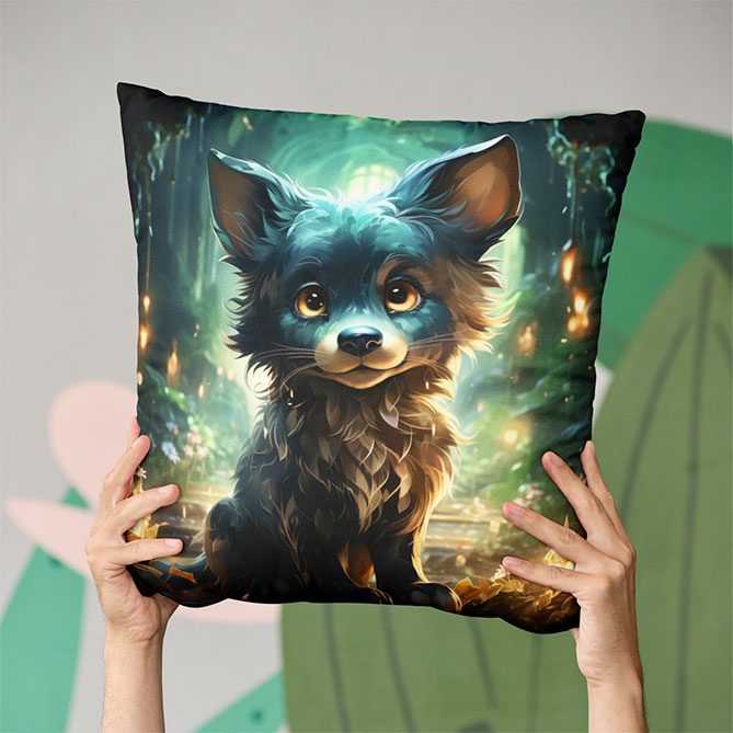 Декоративна подушка «Казковий ліс. Вовченятко» пошита з м’якого, приємного на дотик флока. Наповнювач подушки – холлофайбер високої якості.