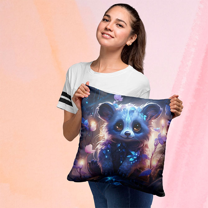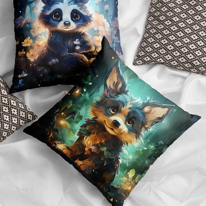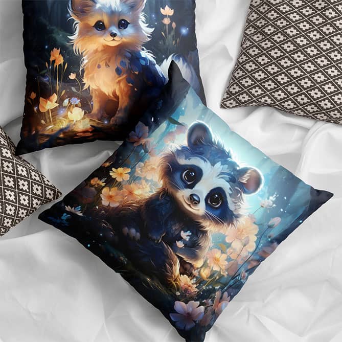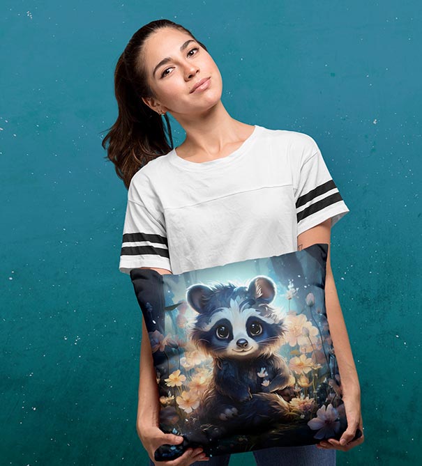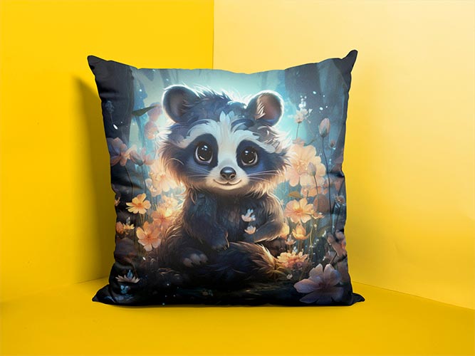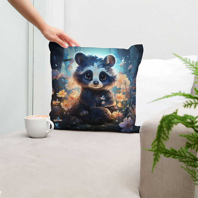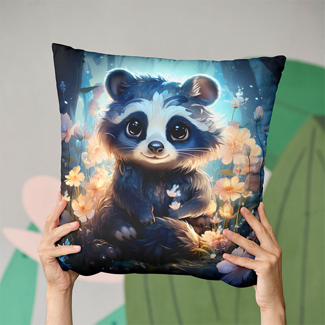 Декоративна подушка «Казковий ліс. Єнотик» пошита з м’якого, приємного на дотик флока. Наповнювач подушки – холлофайбер високої якості.