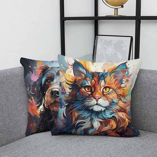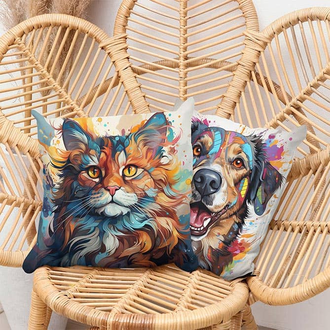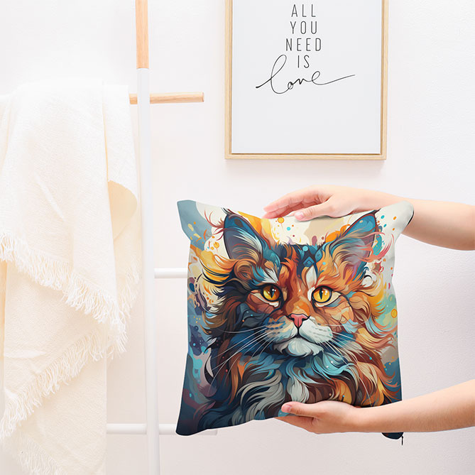 Декоративна подушка «Кіт різнокольоровий арт» пошита з м’якого, приємного на дотик флока. Наповнювач подушки – холлофайбер високої якості.