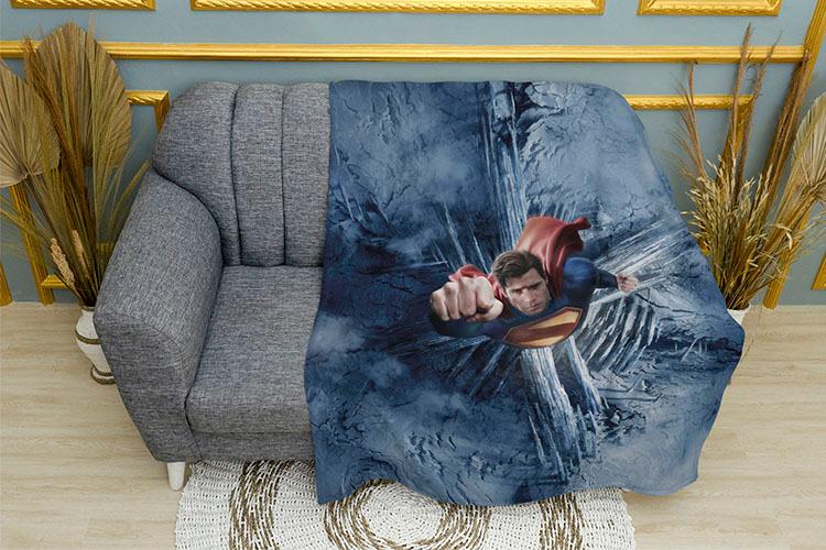 Принт з динамічним зображенням Супермена, що проривається крізь кригу. Принт передає момент максимальної сили, рішучості та швидкості. Плед з таким принтом – ідеальний вибір для фанатів супергероїв, коміксів та активного стилю.