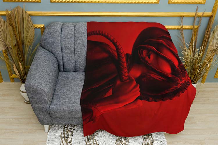 Принт зображує загадкову особу в темному і жахливому контексті, що викликає інтерес і тривогу. Насичені червоні кольори підкреслюють емоційне напруження. Плед з таким дизайном підійде любителям трилерів, хоррор-культури та тим, хто цінує ілюстрації зі складним сюжетом.