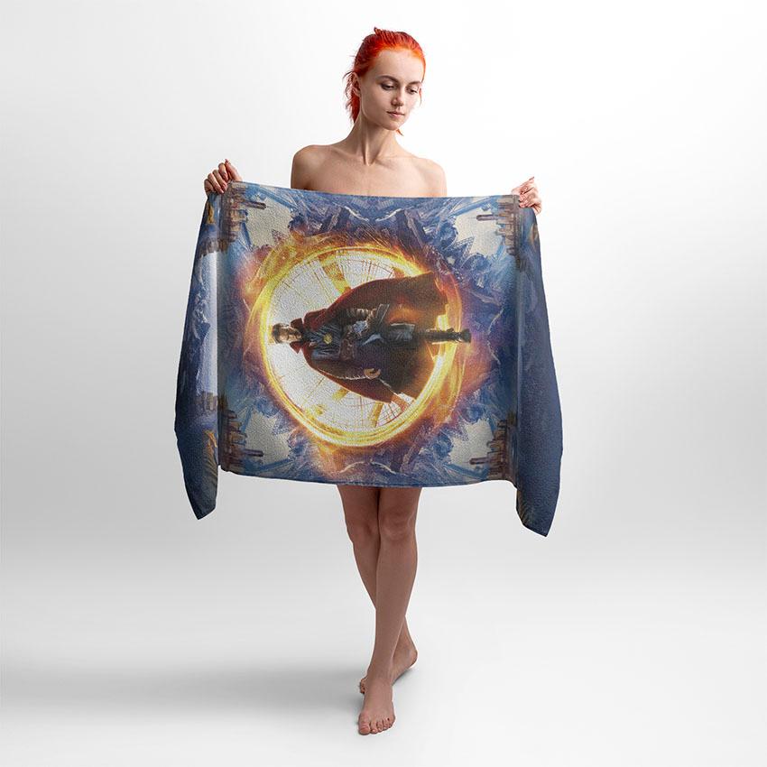Принт зображує героя, що володіє магією та мандрує між вимірами. Динамічна композиція передає атмосферу містики та сили. Рушник з таким принтом підійде фанатам супергероїв, магії та кінематографа, а також тим, хто вірить у безмежні можливості людського розуму. Ідеальний подарунок для фанатів всесвіту Marvel.