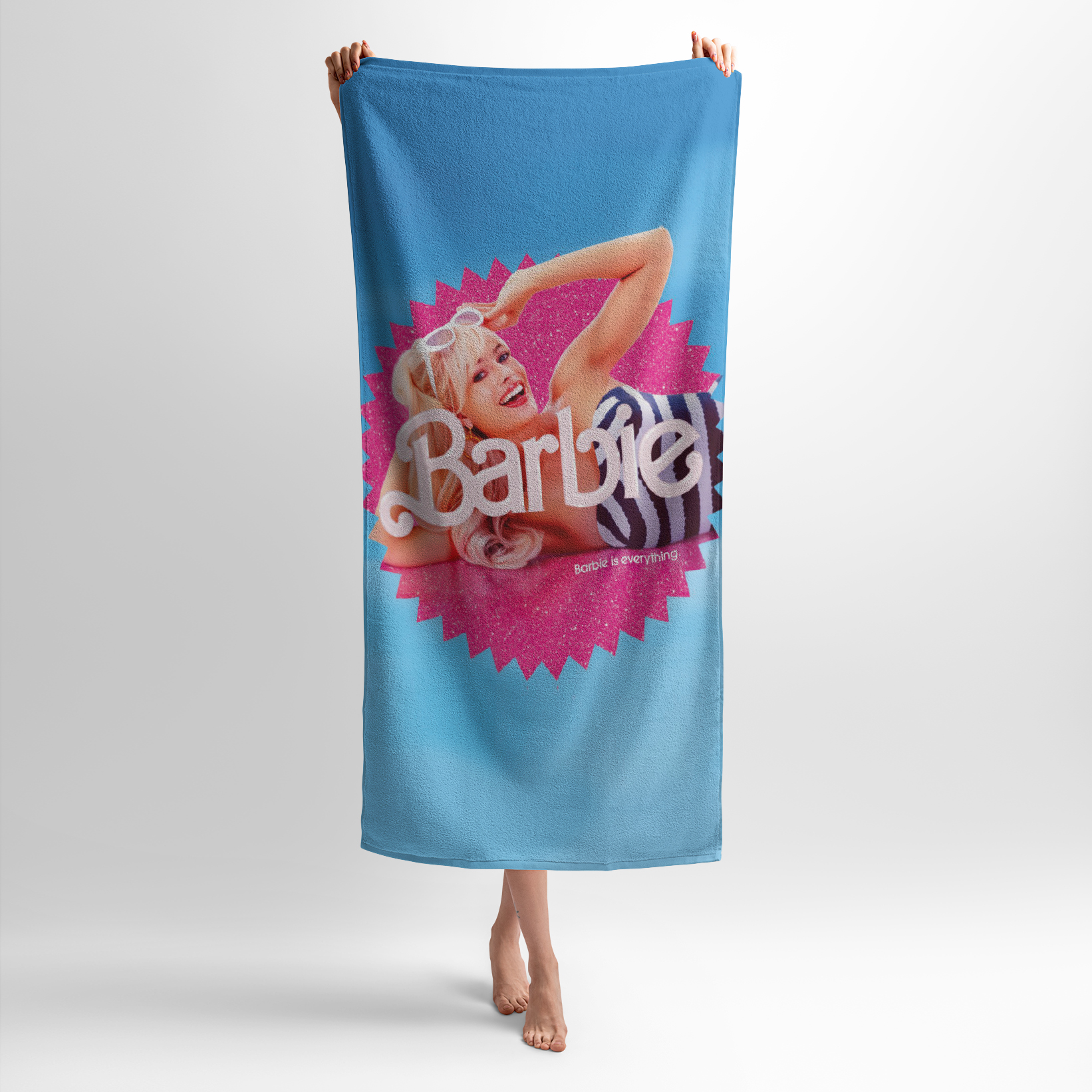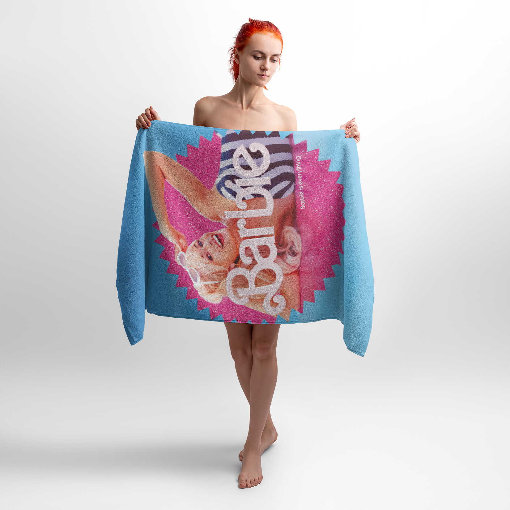Цей принт зображає Марго Роббі в образі Барбі на яскравому рожевому фоні, поєднуючи ретро-стиль та сучасний дизайн. Рушник з цим принтом ідеально підійде фантам фільму Барбі, хлопцям і дівчатам, які цінують яскраві речі та люблять виділятись.
