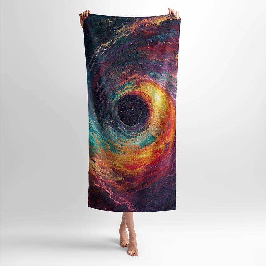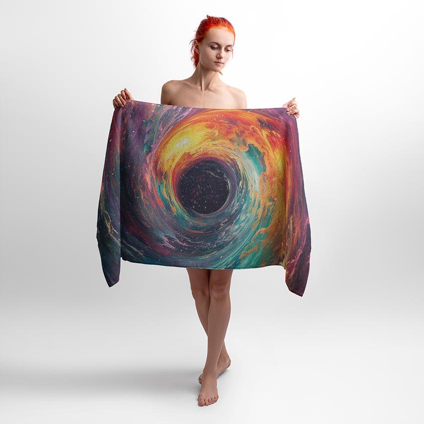 Цей принт зображує чорну діру, оточену кольоровими спіралями галактики. Ідея дизайну – в таємничості всесвіту та безмежності. Рушник з цим принтом підійде тим, хто любить астрономію, мріє про зірки або просто шукає стильний і незвичайний аксесуар. Ідеальний вибір для подарунка чи власного натхнення.