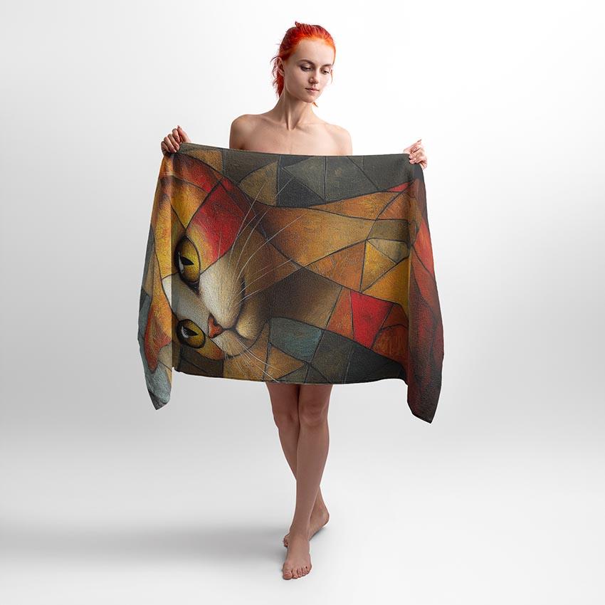 Цей принт – мистецьке втілення котячої грації у стилі мозаїки. Теплі кольори та геометричні форми створюють унікальну атмосферу затишку. Рушник з цим принтом підійде для поціновувачів котів, творчості та стильних інтер’єрів, що шукають щось особливе для натхнення.