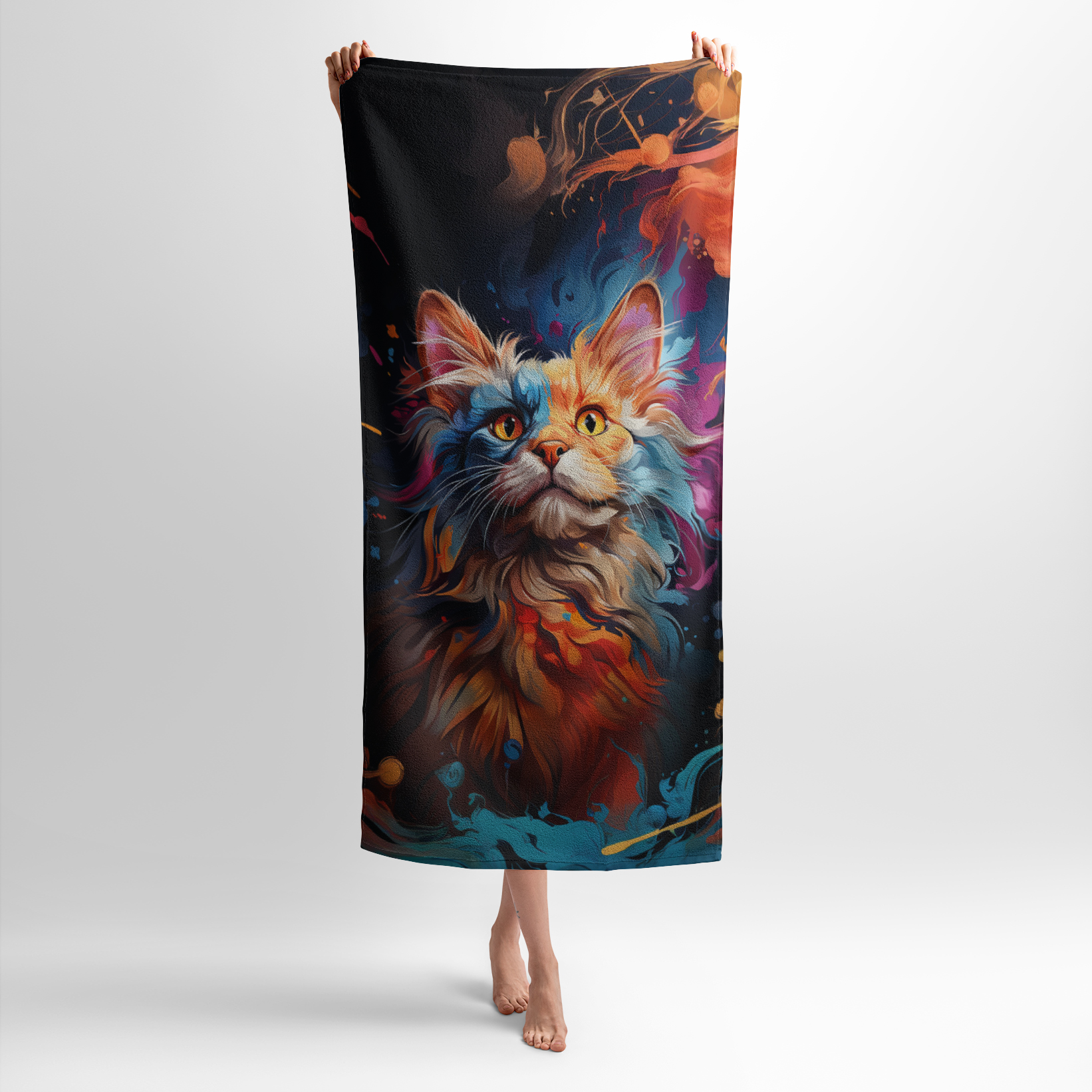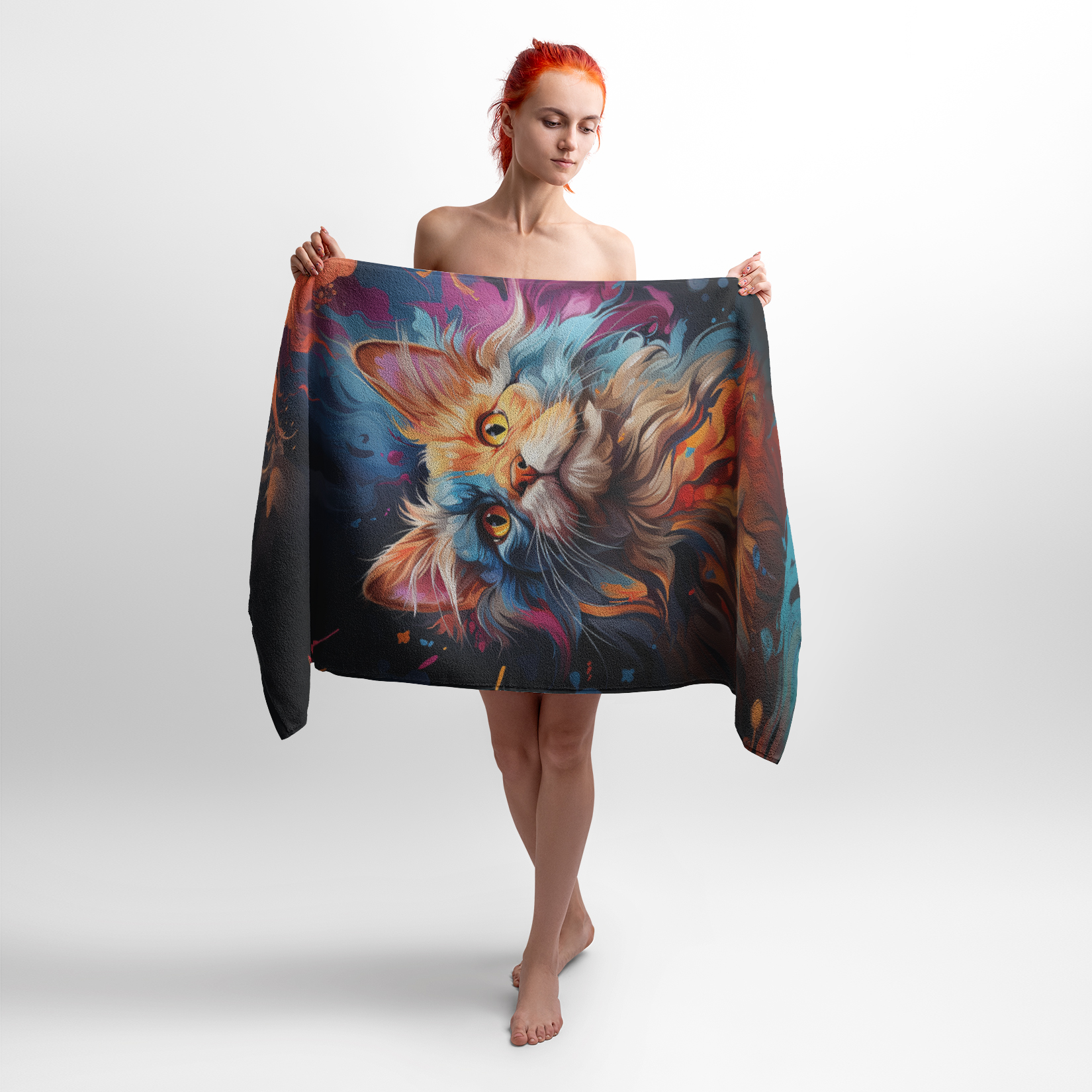 Цей принт із розкішним котом в яскравих кольорах передає веселу і креативну атмосферу. Унікальне поєднання забарвлень підкреслює індивідуальність та грацію тварини. Рушник з цим принтом підійде любителям котів, мистецтва та всім, хто хоче додати яскравості у своє життя.