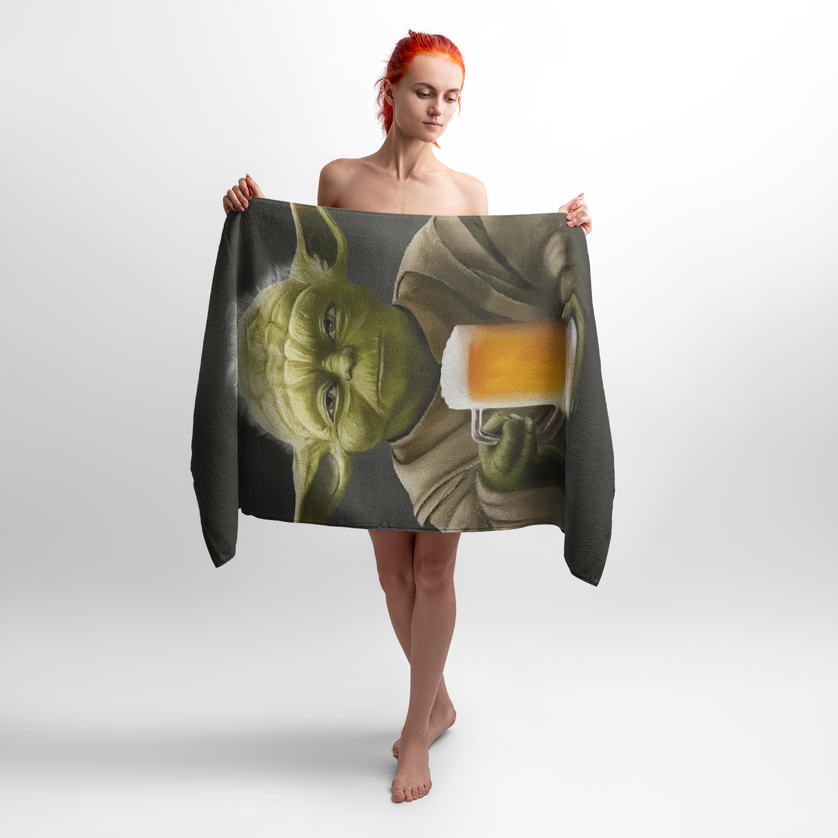 Цей принт зображує відомого героя з культової саги, що тримає пиво, символізуючи веселий підхід до життя. Яскраві кольори та оригінальний дизайн створюють легку атмосферу. Рушник з таким принтом підійде фанатам фантастики, любителям гумору та всім, хто любить насолоджуватися життям.