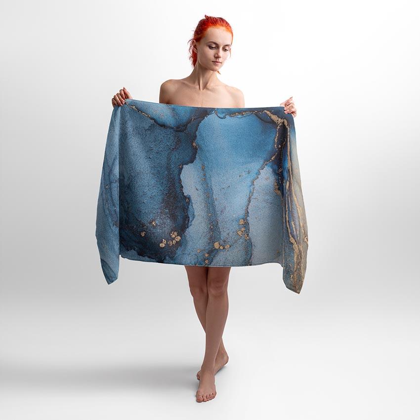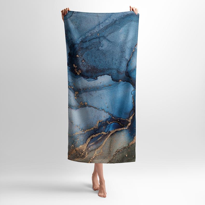 Принт імітує текстуру мармуру з глибокими відтінками синього та золотими акцентами, що створюють атмосферу розкоші та гармонії. Це поєднання природної краси й елегантного дизайну. Рушник з цим принтом ідеально підійде для любителів мінімалізму, стилю та природних мотивів.