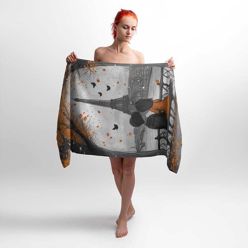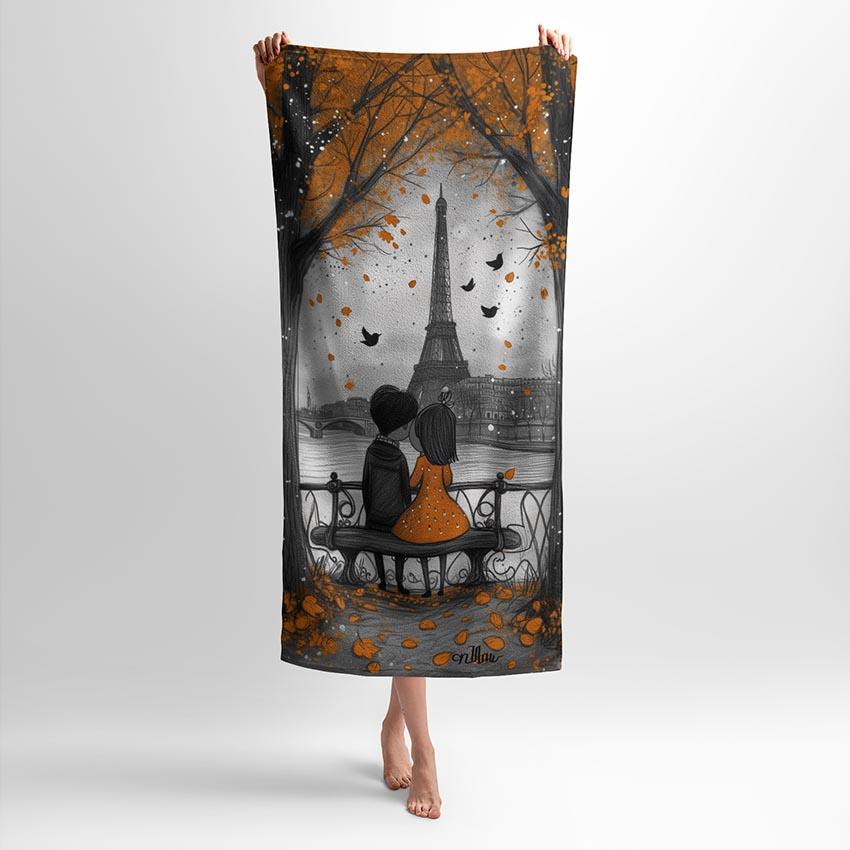 Принт з парою, що сидить на лавці біля Ейфелевої вежі, створює атмосферу романтики. Чорно-помаранчева палітра додає контрасту та тепла. Ідеально підійде для закоханих, мрійників чи всіх, хто обожнює Париж і його романтичну ауру. Цей рушник стане чудовим подарунком або стильним доповненням до вашого дому.