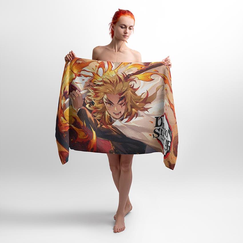 Рушник з принтом “Ренгоку. Клинок, який знищує демонів” натхненний популярним аніме Demon Slayer. Він зображає героя Ренгоку, символ мужності та боротьби з темними силами. Ідеальний для фанатів аніме, які хочуть додати енергії та сили в свій повсякденний стиль. Підійде як для дому, так і для подарунка.