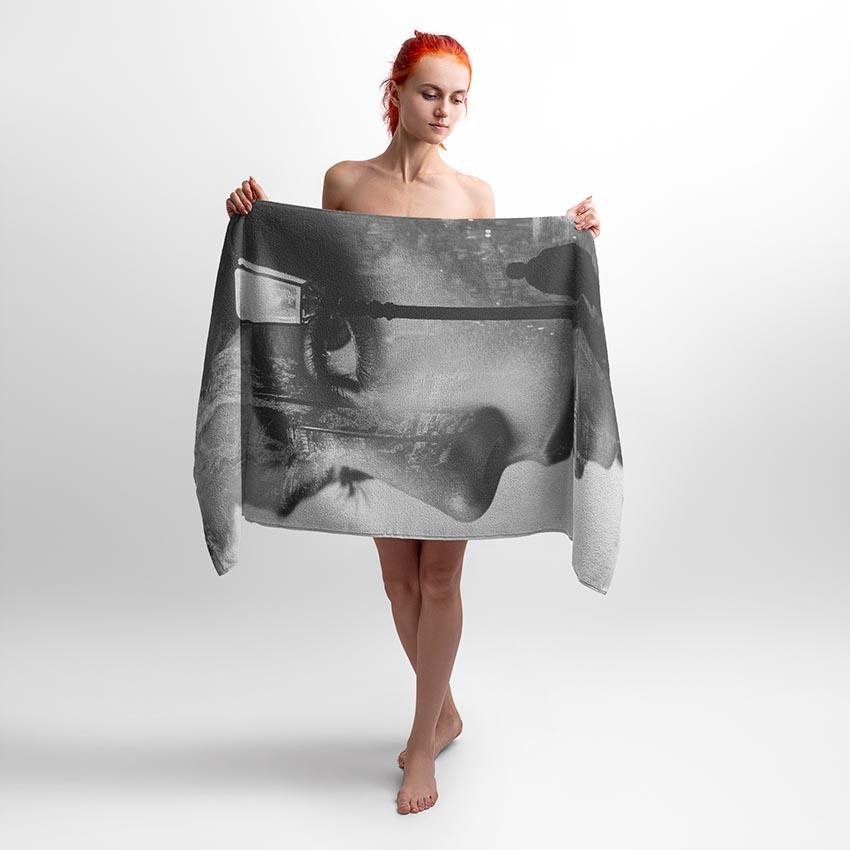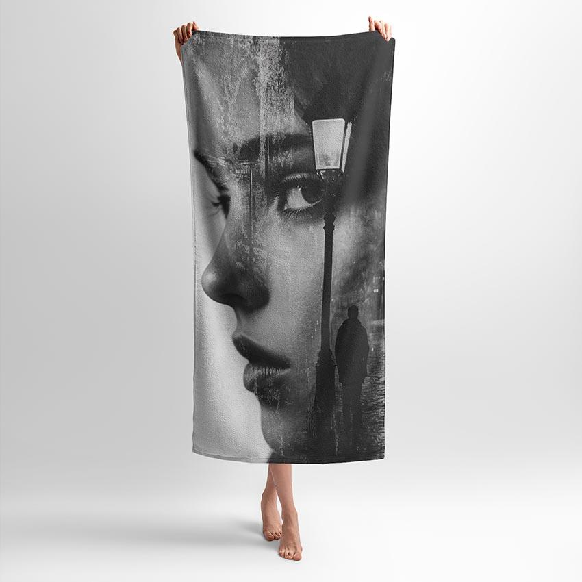 Принт поєднує емоційний портрет і атмосферу нічного міста. Контрастні чорно-білі тони створюють глибину і загадковість. Ідеально підходить для людей, які цінують мистецтво, стиль і мінімалізм. Рушник з таким принтом – чудовий вибір для дому, пляжу або подарунка.
