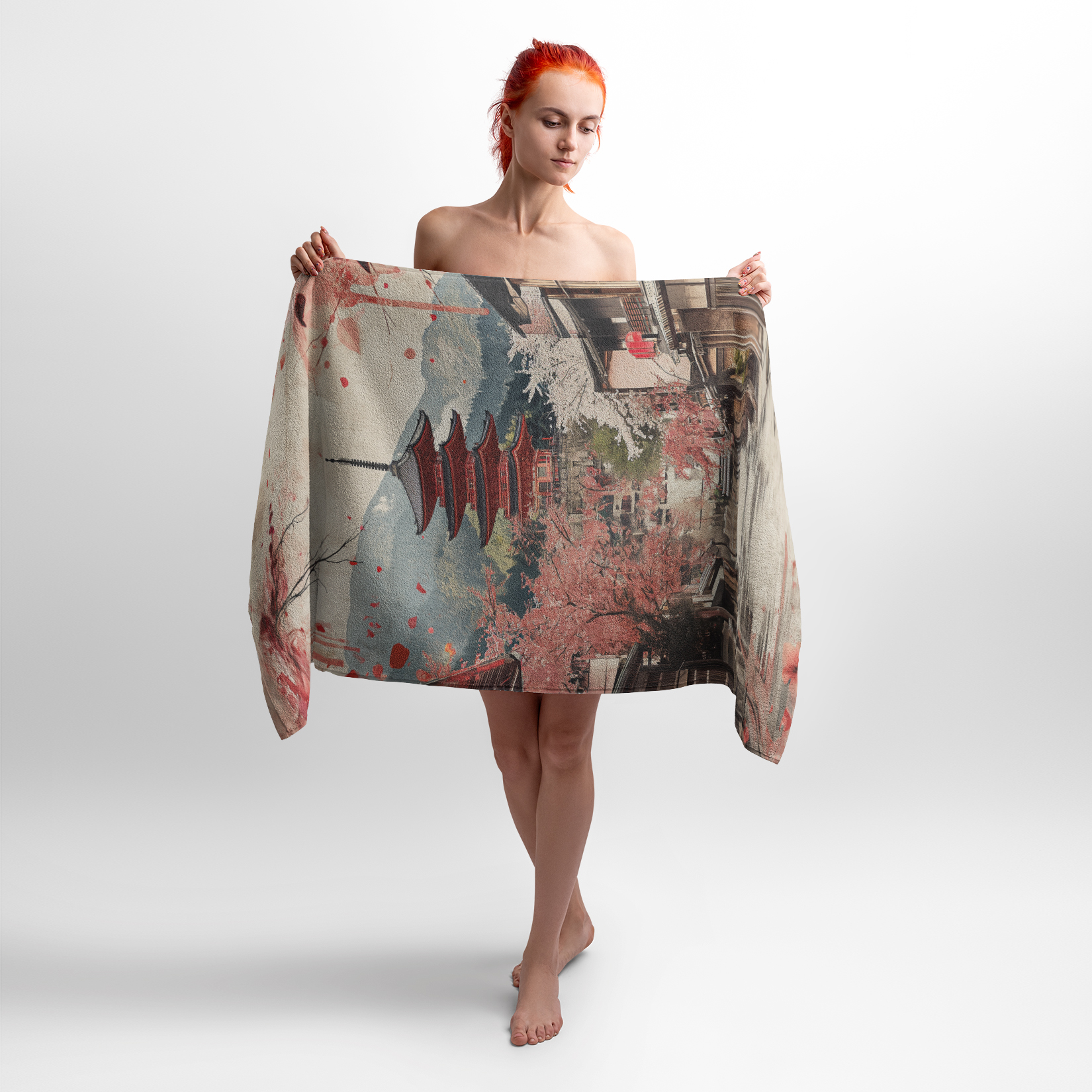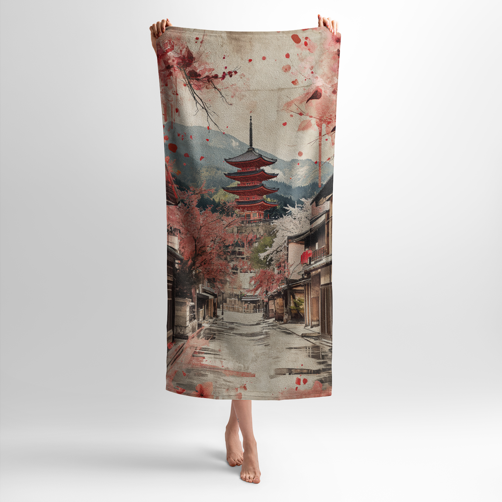 Принт з зображенням японського храму на фоні розквітлих сакур символізує красу та спокій природи. М’які кольори та акуратні деталі передають атмосферу традиційної Японії. Рушник з тамикм принтом підійде любителям культури, подорожей та всім, хто цінує естетику Сходу.