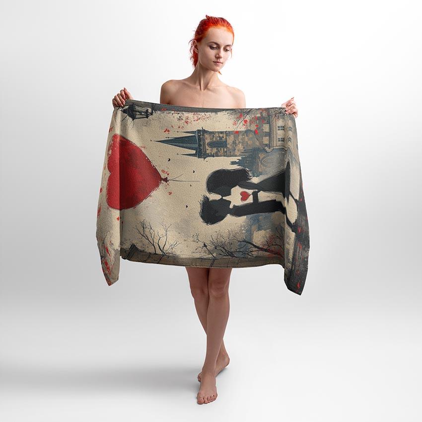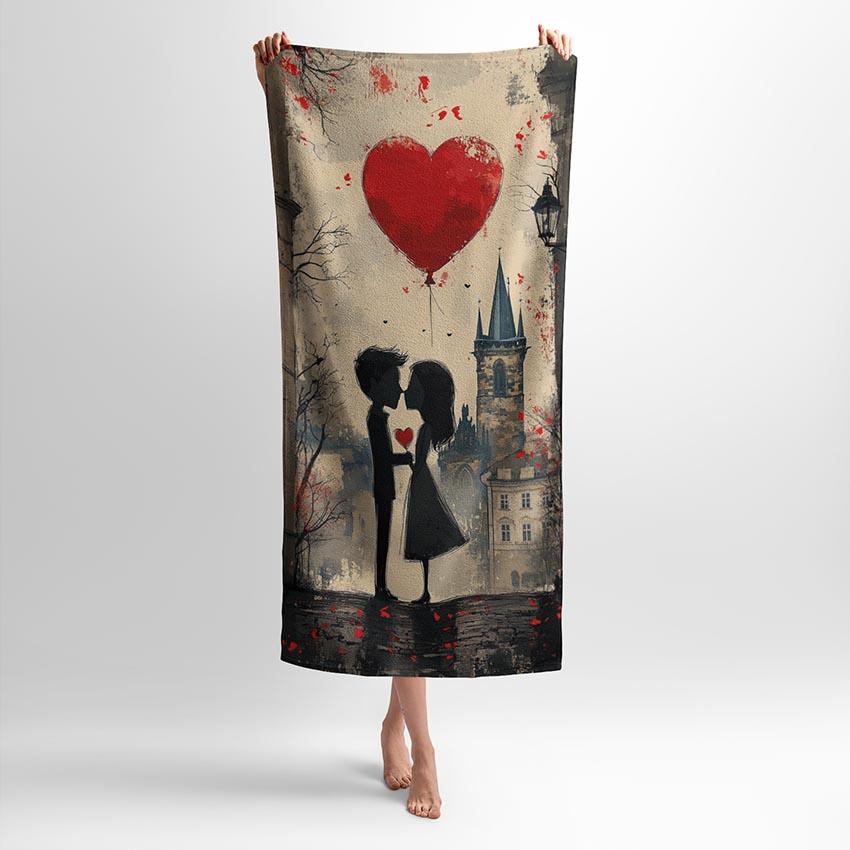 Цей принт показує двох закоханих під червоним серцем, що символізує любов і єдність. Яскраві кольори та емоційна атмосфера переносять у романтичний світ. Рушник з таким принтом підходить для пар, які шукають спосіб виразити свої почуття коханій людині.
