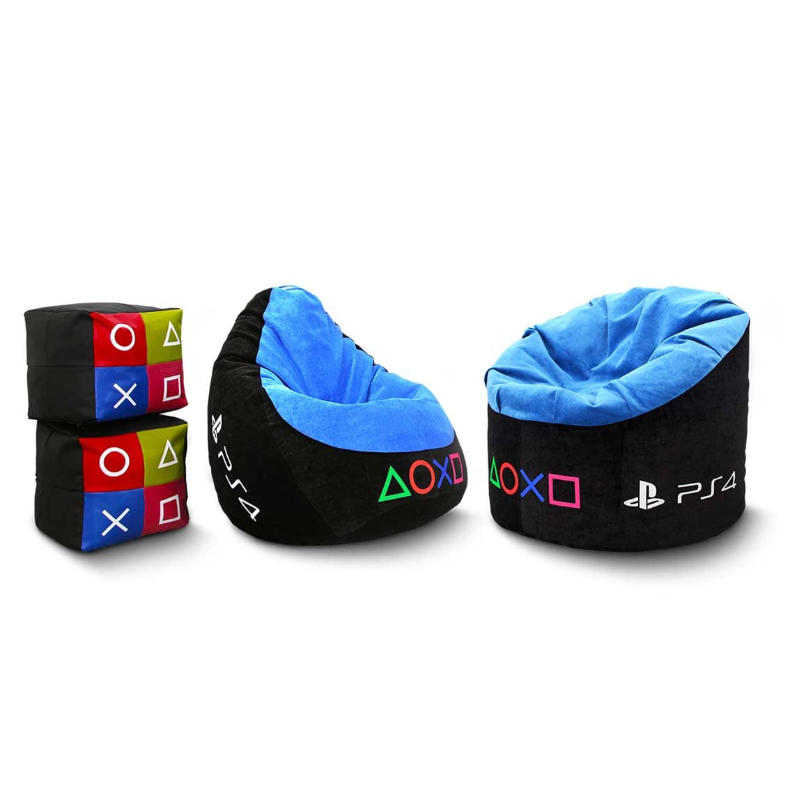 Обожаете играть на приставке PS 4 и сидеть часами за любимой игрой? В таком случае вам нужен комплект бескаркасной мебели с логотипом «PS 4» от TM PromoPuff. В комплект входит кресло мешок, кресло папасан и дополнительно два пуфа. Кресло в данном комплекте представлено в размере XXXL — с шириной — 100 см, и высотой — 135 см. Этот размер для тех кто любит отдыхать по королевски.