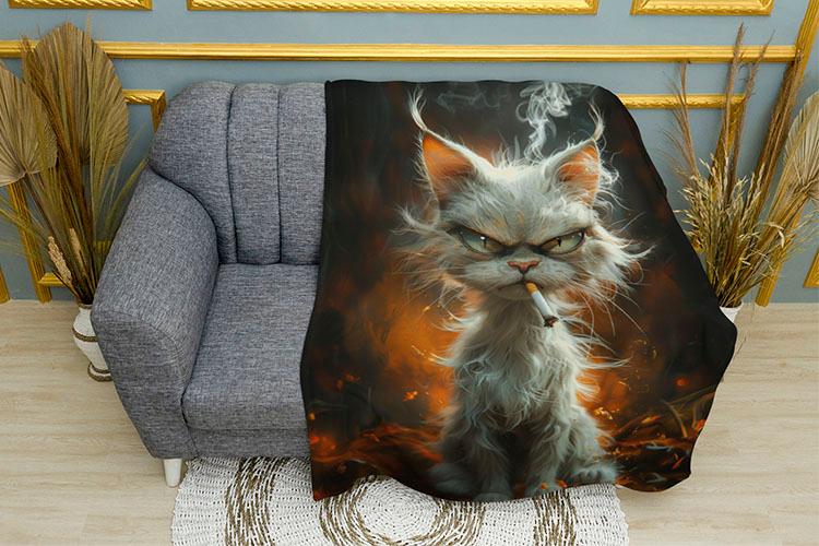 Плед с принтом «Кот Бунтарь» — для тех, кто не играет по правилам. Саркастичный кот с сигаретой на фоне огня символизирует свободу, независимость и характер. Идеальный выбор для подростков, креативных личностей и всех, кто ценит иронию и стиль.