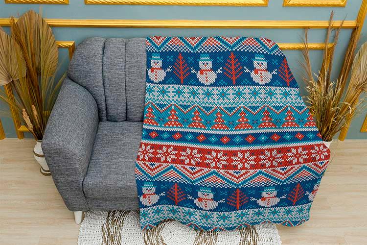 Этот плед с ярким зимним принтом придает атмосферу праздника и уюта. Красные, зеленые и синие цвета в сочетании со снеговиками и елками создают настроение новогодних праздников. Уникальность принта заключается в его традиционном вязании, которое напоминает о домашнем комфорте. Плед идеально подходит для семейных встреч или романтических вечеров. Он станет отличным подарком для тех, кто ценит тепло домашнего уюта.