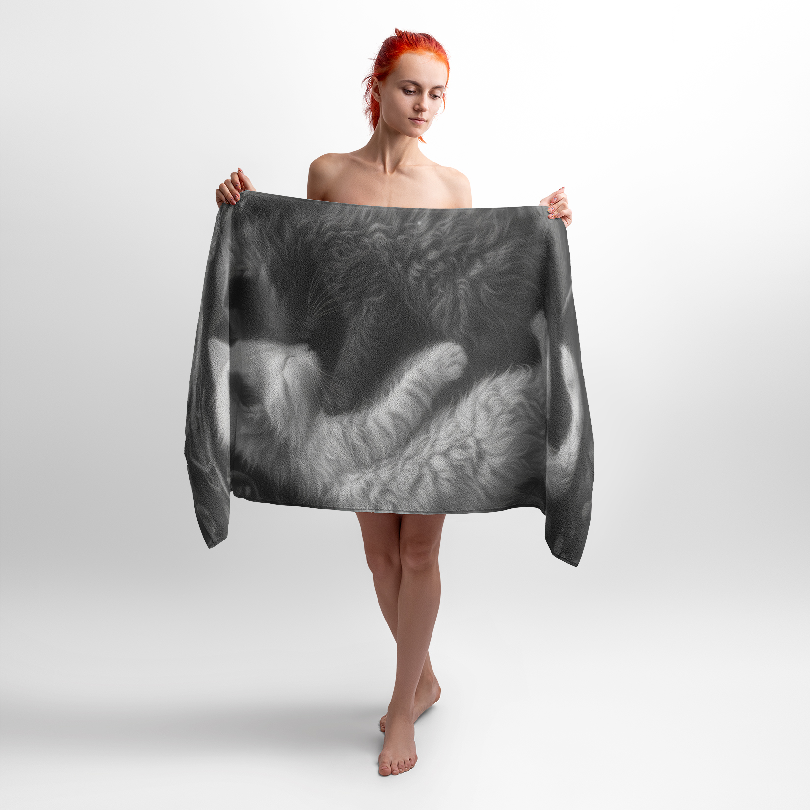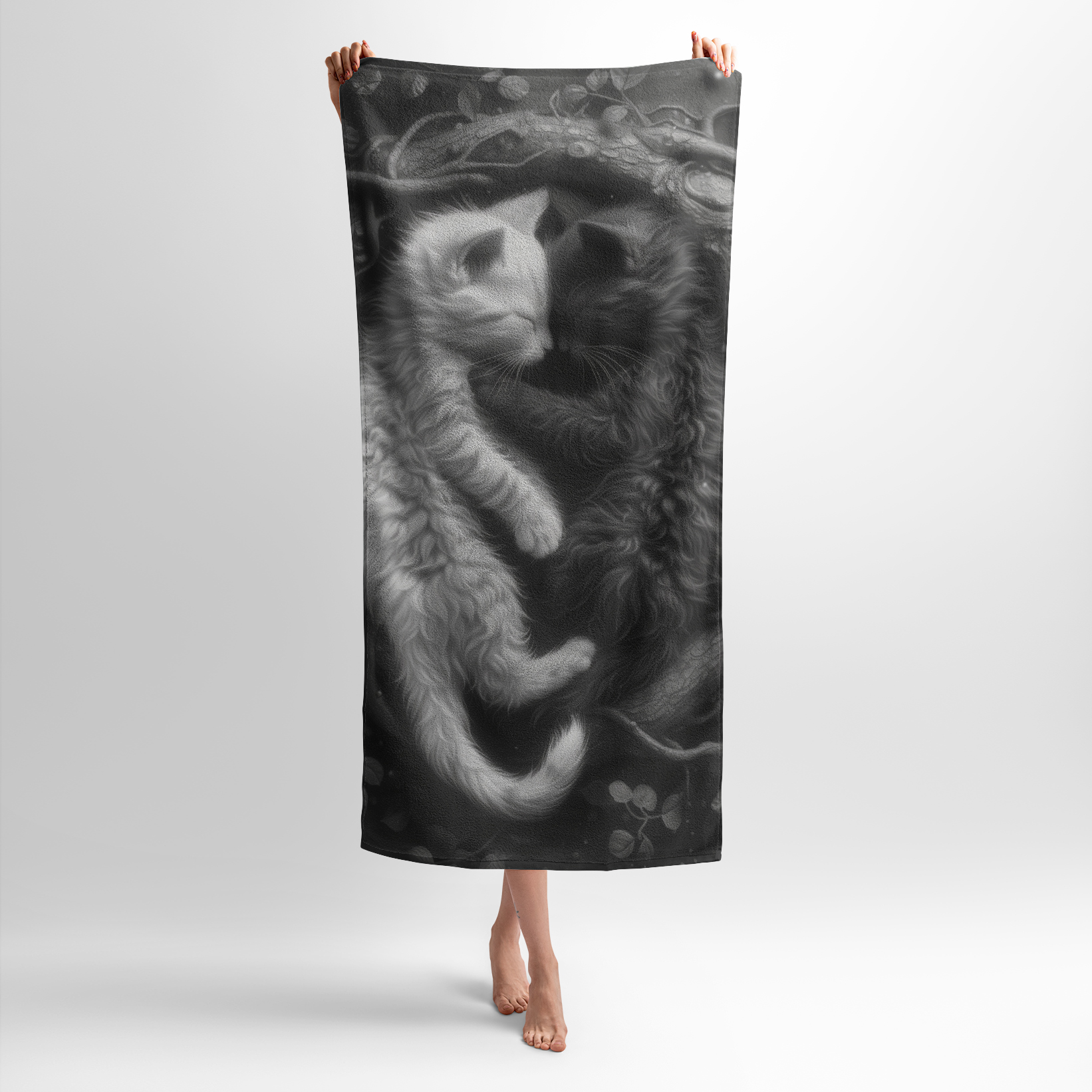 Принт с двумя милыми котятами, которые мирно спят друг возле друга, символизирует любовь, спокойствие и уют. Стильный черно-белый рисунок добавит элегантности и тепла в ваш интерьер. Полотенце с таким принтом отличный выбор для тех, кто ищет оригинальный аксессуар для ванной, кухни или в качестве подарка для фанатов животных.