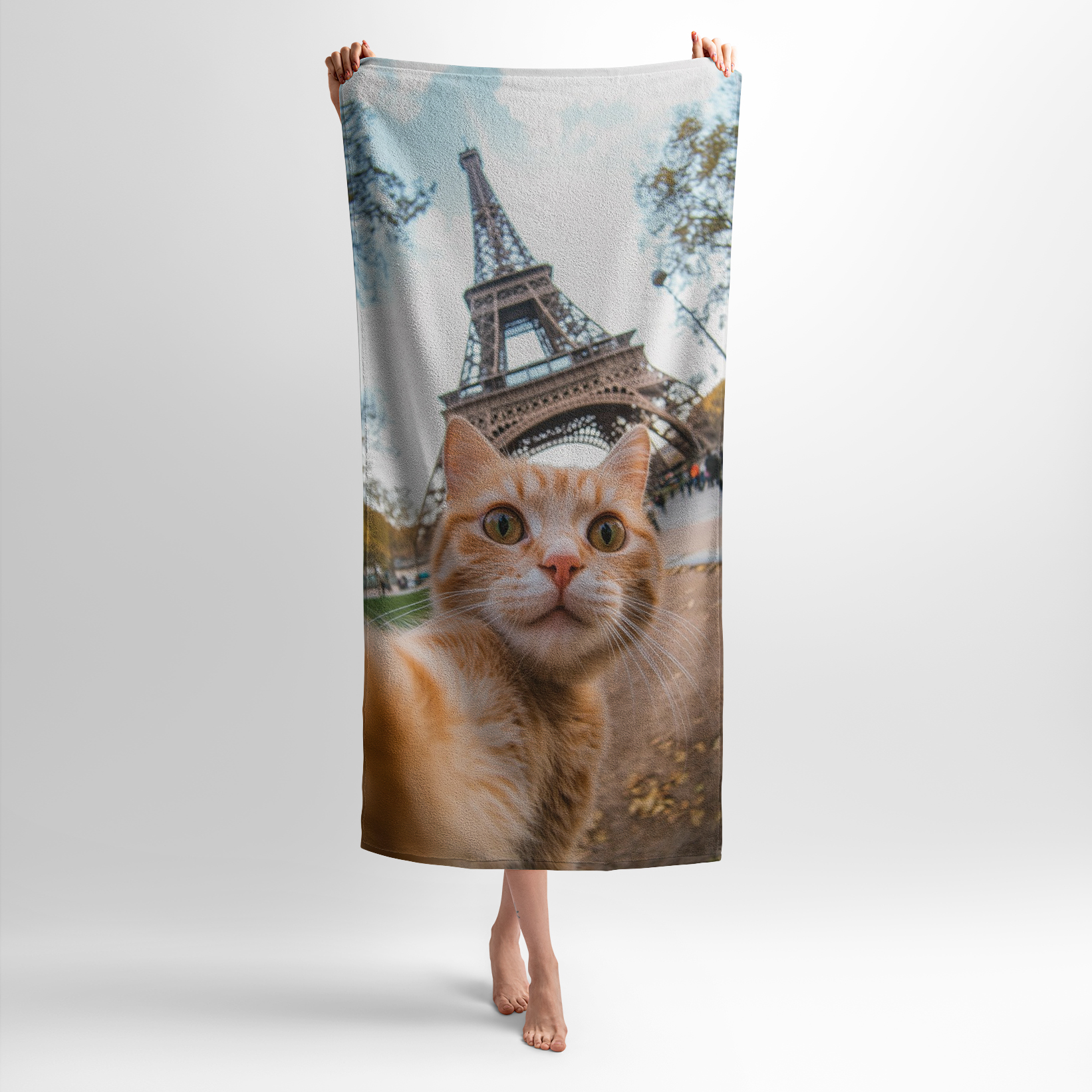 Этот принт с рыжим котом на фоне Эйфелевой башни создает атмосферу веселья. Полотенце с таким принтом идеально подойдет для тех, кто любит уют, мечтательные путешествия и хочет добавить в интерьер нотку тепла и юмора. Отличный подарок для романтиков, любителей животных и Парижа.