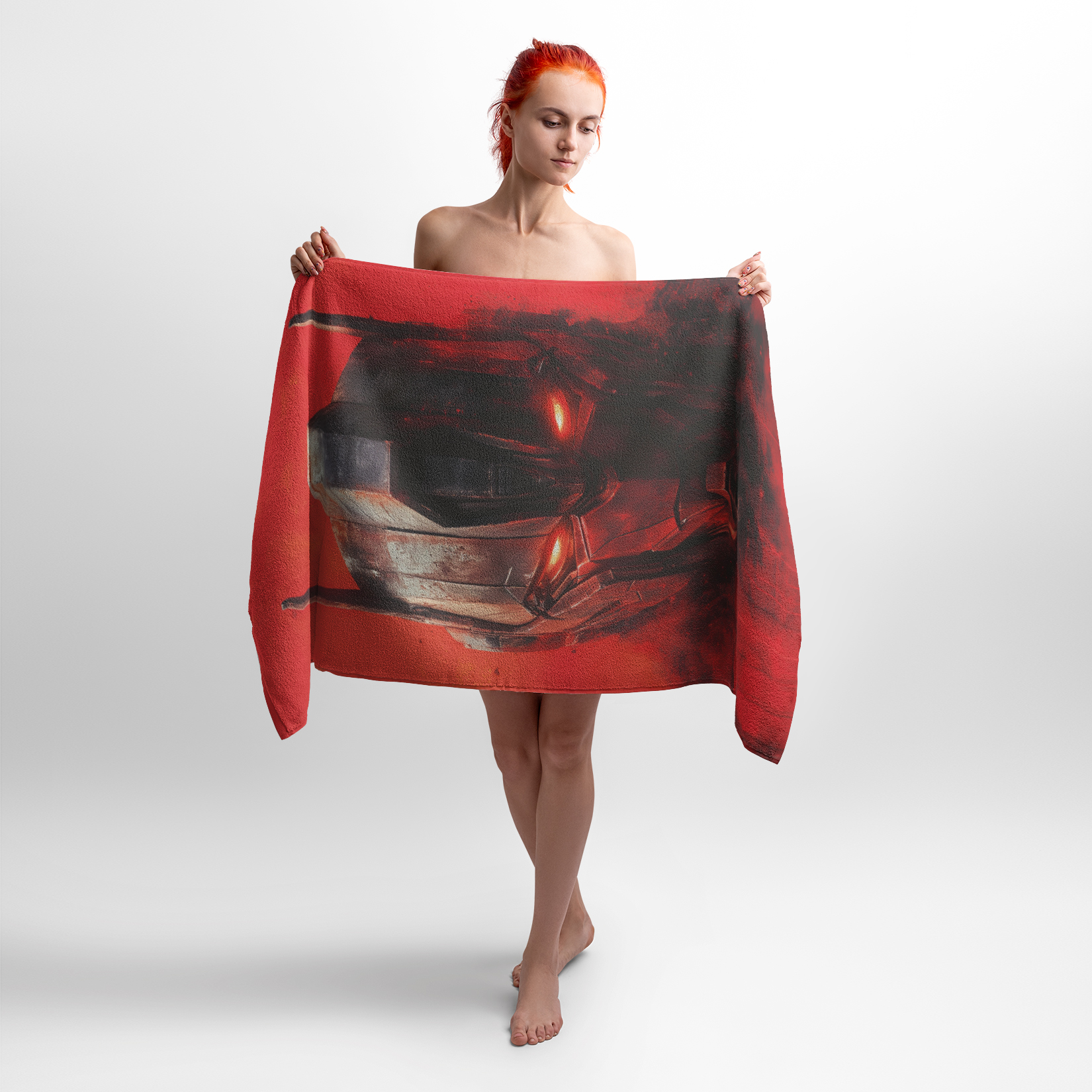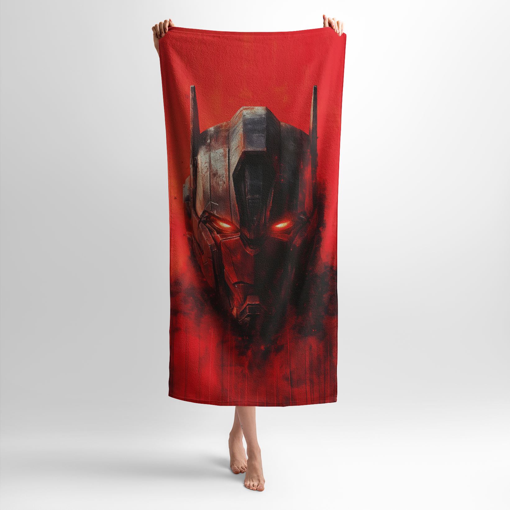 Принт с образом могучего трансформера на красном фоне воплощает силу, технологии и мистичность. Интенсивные цвета и выразительные детали создают атмосферу энергии и динамики. Полотенце с таким принтом подойдет фанатам фантастики, комиксов и кино, а также молодежи, которая ценит оригинальные дизайны.