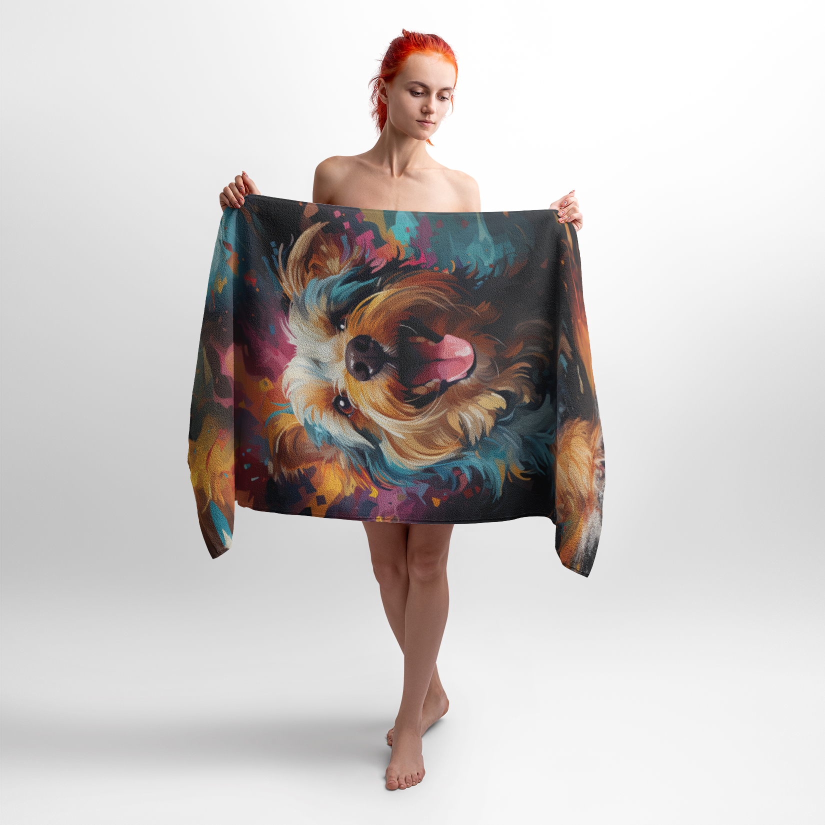 Полотенце с принтом «Йоркширский терьер в красках» — это яркое сочетание искусства и любви к собакам. Стильный дизайн в насыщенных цветах передает энергию и игривый характер йорка. Идеально подойдет владельцам этой породы, любителям ярких акцентов в текстиле и тем, кто ценит уникальные принты. Дополнит интерьер ванной комнаты или станет оригинальным подарком.