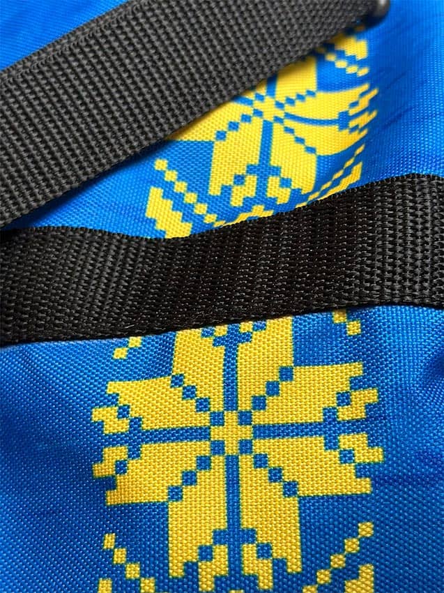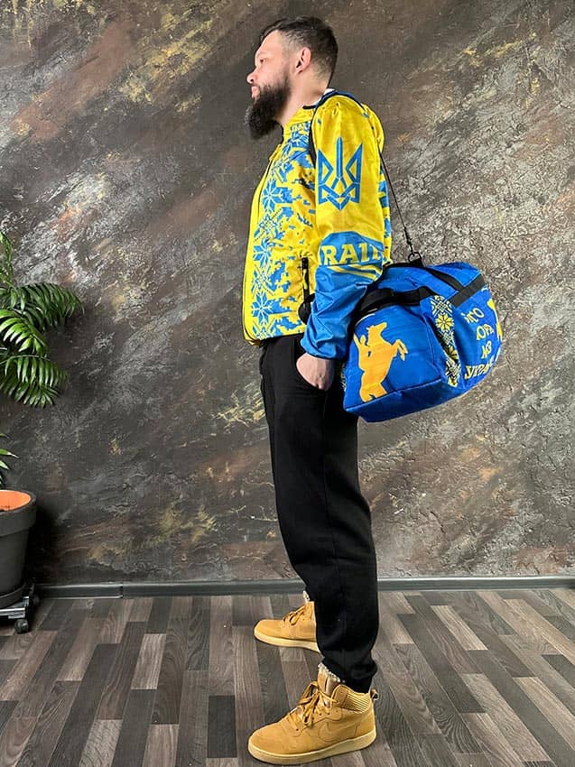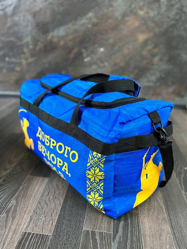 Спортивная сумка Трип «Доброго вечора, ми з України!» синяя, объёмом 76 литров изготовлена из материала Оксфорд плотностью 230 гр/м.кв 600 DEN. Прочная синтетическая ткань с дополнительным слоем водоудерживающей пропитки, легко отстирывается, не трескается и не расслаивается при минусовой температуре.